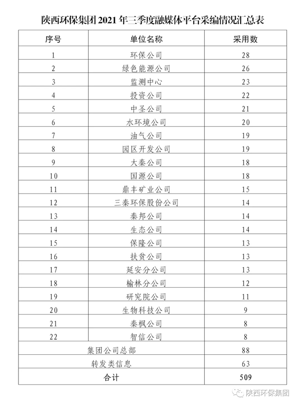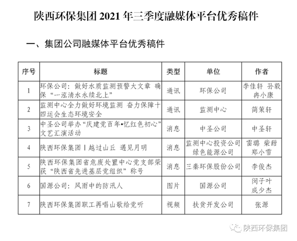 為加強集團公司門戶網站、微信公眾號、新浪微博等融媒體平臺的稿件采編工作,鼓勵廣大通訊員圍繞企業中心工作撰寫出高質量的稿件,發揮優秀稿件的示范作用,為集團高質量發展鼓與呼,按照集團公司《關于建立政務信息采用情況通報和優秀稿件評選制度的通知》(陜環司函〔2021〕31號)文件要求,現將2021年三季度集團公司融媒體平臺稿件采用及優秀稿件評選情況通報如下: