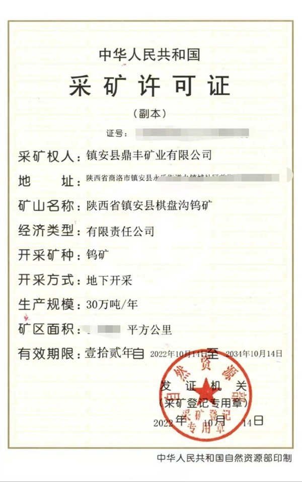 1月11日,鼎豐礦業公司取得了自然資源部頒發的鎮安縣棋盤溝鎢礦《采礦許可證》。