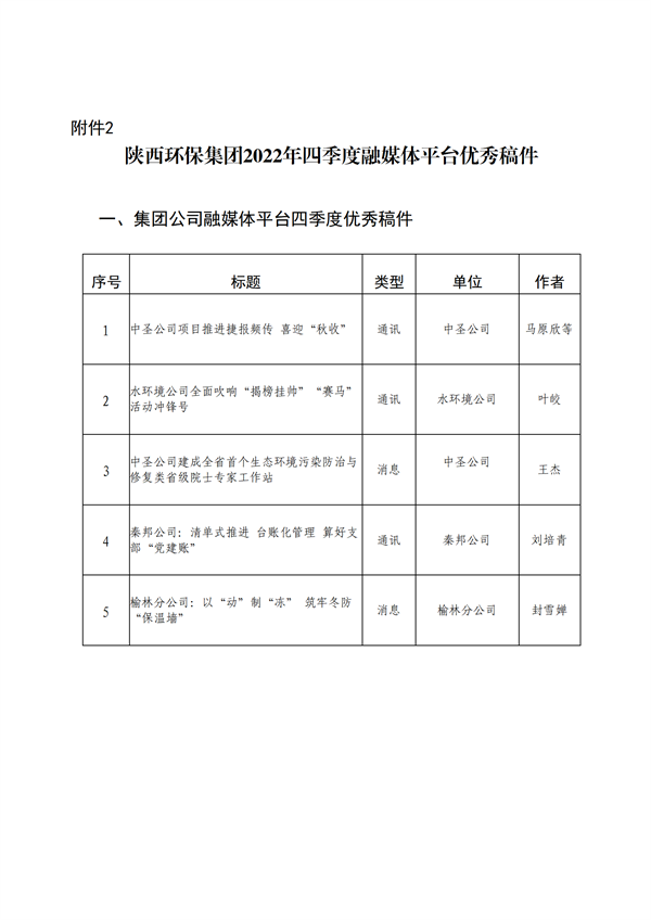 為加強(qiáng)集團(tuán)公司門戶網(wǎng)站、微信公眾號、新浪微博、視頻號等融媒體平臺(tái)的稿件采編工作,鼓勵(lì)廣大通訊員圍繞企業(yè)中心工作撰寫出高質(zhì)量的稿件,發(fā)揮優(yōu)秀稿件的示范作用,為集團(tuán)高質(zhì)量發(fā)展鼓與呼,按照集團(tuán)公司《關(guān)于建立政務(wù)信息采用情況通報(bào)和優(yōu)秀稿件評選制度的通知》(陜環(huán)司函(2021〕31號)文件要求,現(xiàn)將2022年度集團(tuán)公司融媒體平臺(tái)稿件采用及2022年四季度優(yōu)秀稿件評選情況通報(bào)如下: