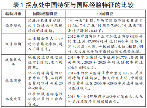 四是中國基本具備了環(huán)境庫茲涅茨曲線拐點(diǎn)發(fā)生的經(jīng)濟(jì)特征。通過將中國當(dāng)前的經(jīng)濟(jì)特征與國際經(jīng)驗(yàn)進(jìn)行比較,可以發(fā)現(xiàn)除了城鎮(zhèn)化水平之外,其他經(jīng)濟(jì)特征中國均已呈現(xiàn)(見表1)。城鎮(zhèn)化水平的滯后可能會(huì)導(dǎo)致中國環(huán)境庫茲涅茨曲線拐點(diǎn)的扁平化和波動(dòng)性。