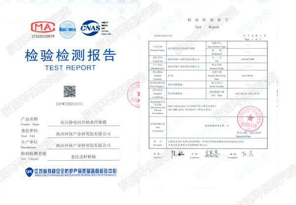 近日,研究院公司聯合眾創空間入孵企業—陜西容納材料科技公司研發的高壓靜電紡絲納米纖維膜委托江蘇省特種安全防護產品質量監督檢驗中心檢驗,結果合格。其中過濾效率及氣流阻力均滿足《日常防護型口罩技術規范》GB/T32610-2016、《醫用防護口罩技術要求》GB19083-2010等最新國標的要求。